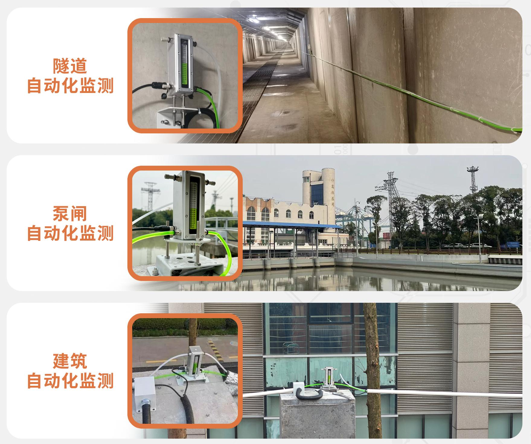 机器视觉静力水准仪内部配有CMOS线阵相机,通过CMOS传感器直接检测液面分界面的垂直位置变化来确定当前液面高度,平台间接算出结构物沉降。本产品安装于结构物表面,可应用于桥梁、隧道、建筑物等结构物的沉降监测。