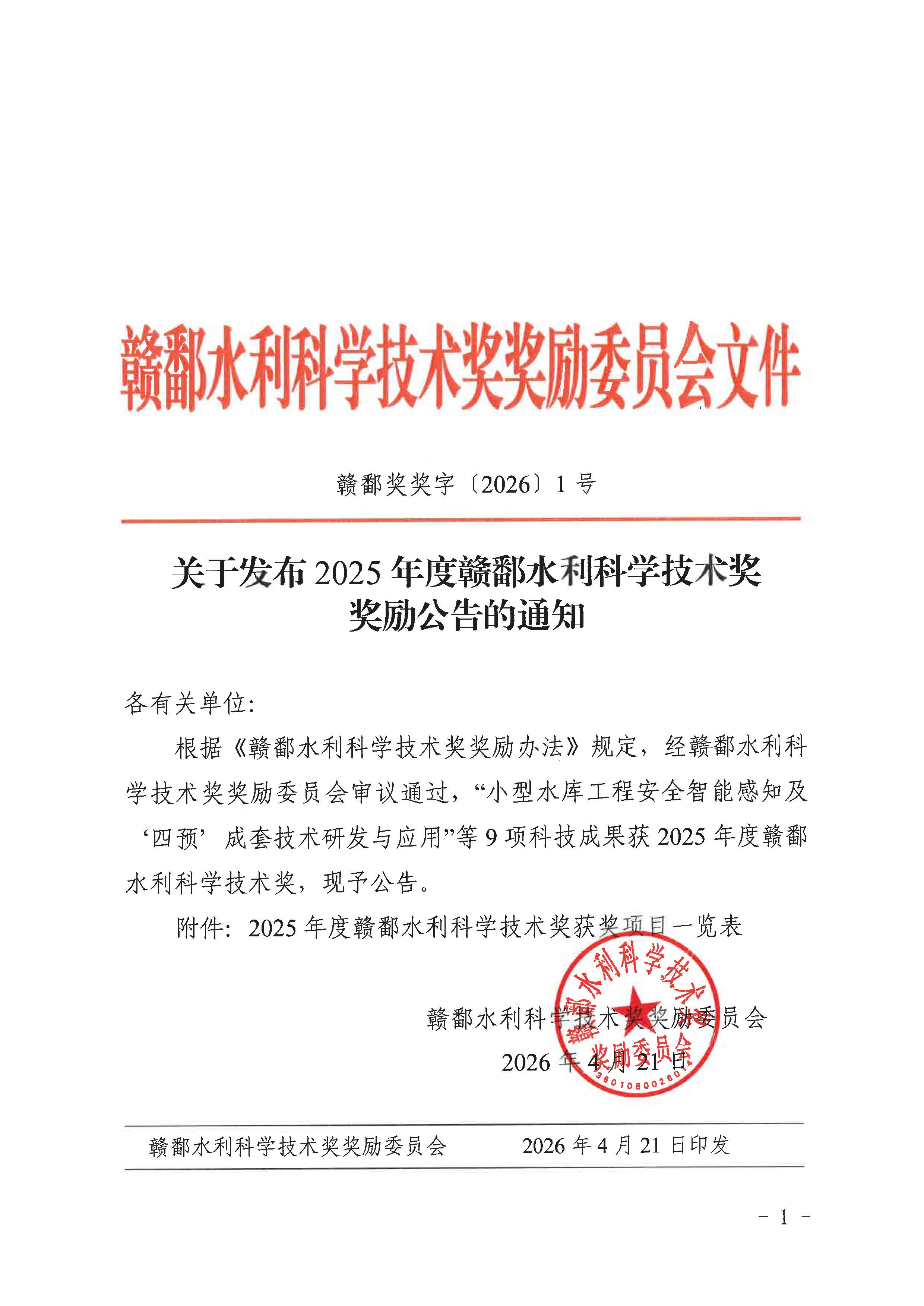 4月21日,赣鄱水利科学技术奖奖励委员会发布《2025年度赣鄱水利科学技术奖奖励公告》。由江西省水利科学院牵头,上海同禾工程科技股份有限公司等多家单位共同完成的《小型水库工程安全智能感知及“四预”成套技术研发与应用》项目,荣获科技进步奖特等奖!